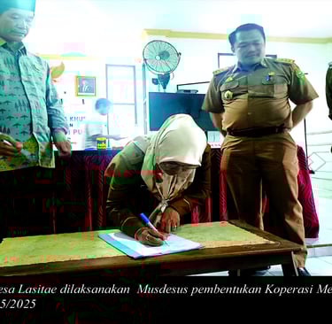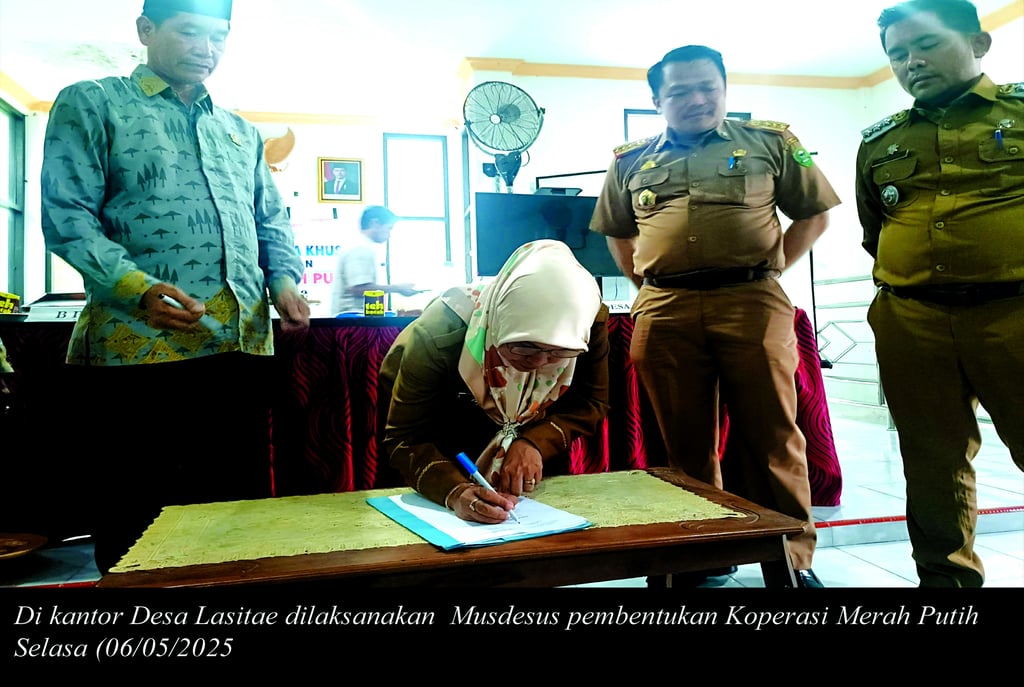"Pelaksanakan Musdesus dalam rangka pembentukan koperasi merah putih lasitae untuk memperkuat perekonomian desa berbasis usaha kolektif masyarakat, " kata Kades Kartini.